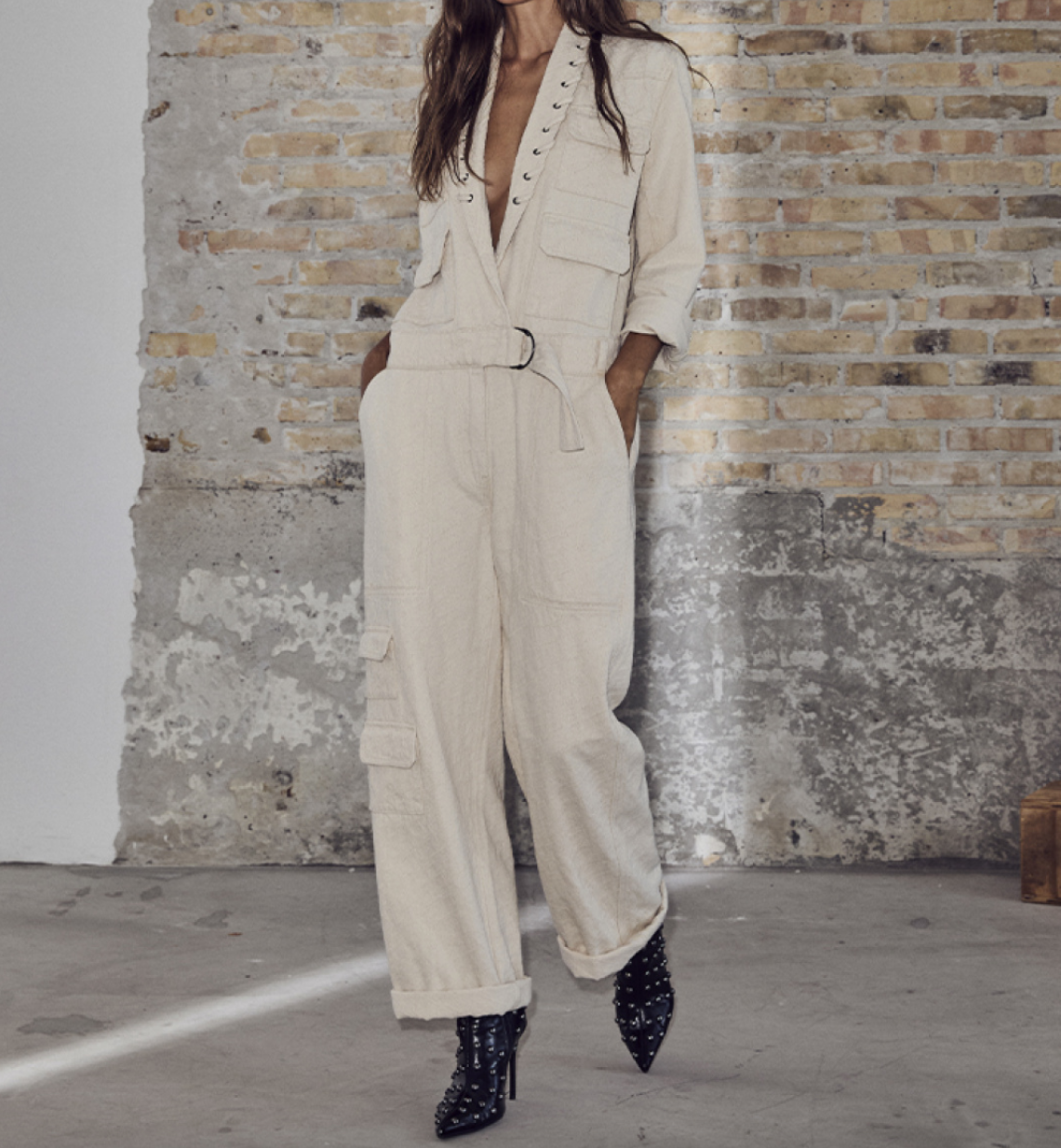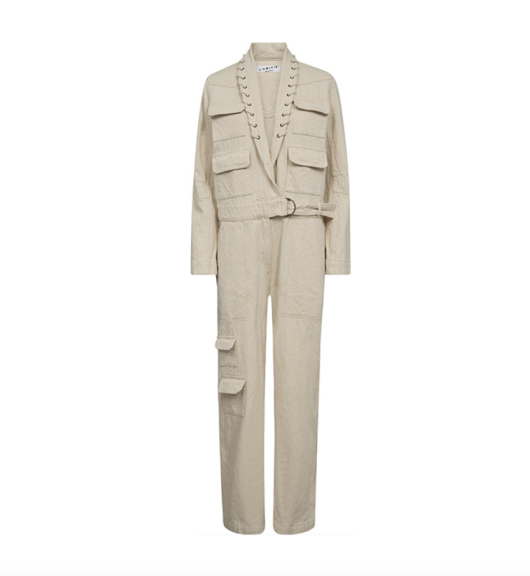 Cool buksedragt fra Haute L’Amitié i en lækker creme nuance. Modellen har lange ærmer og en regular fit, som gør den både behagelig og cool i udtryk. Buksedragten har en dyb udskæring, men flettet detaljer og er i en lækker blød kvalitet. Et stilrent og afslappet look, den at style til hverdag eller mere casual brug, eller pift den op med et par høje hæle.
