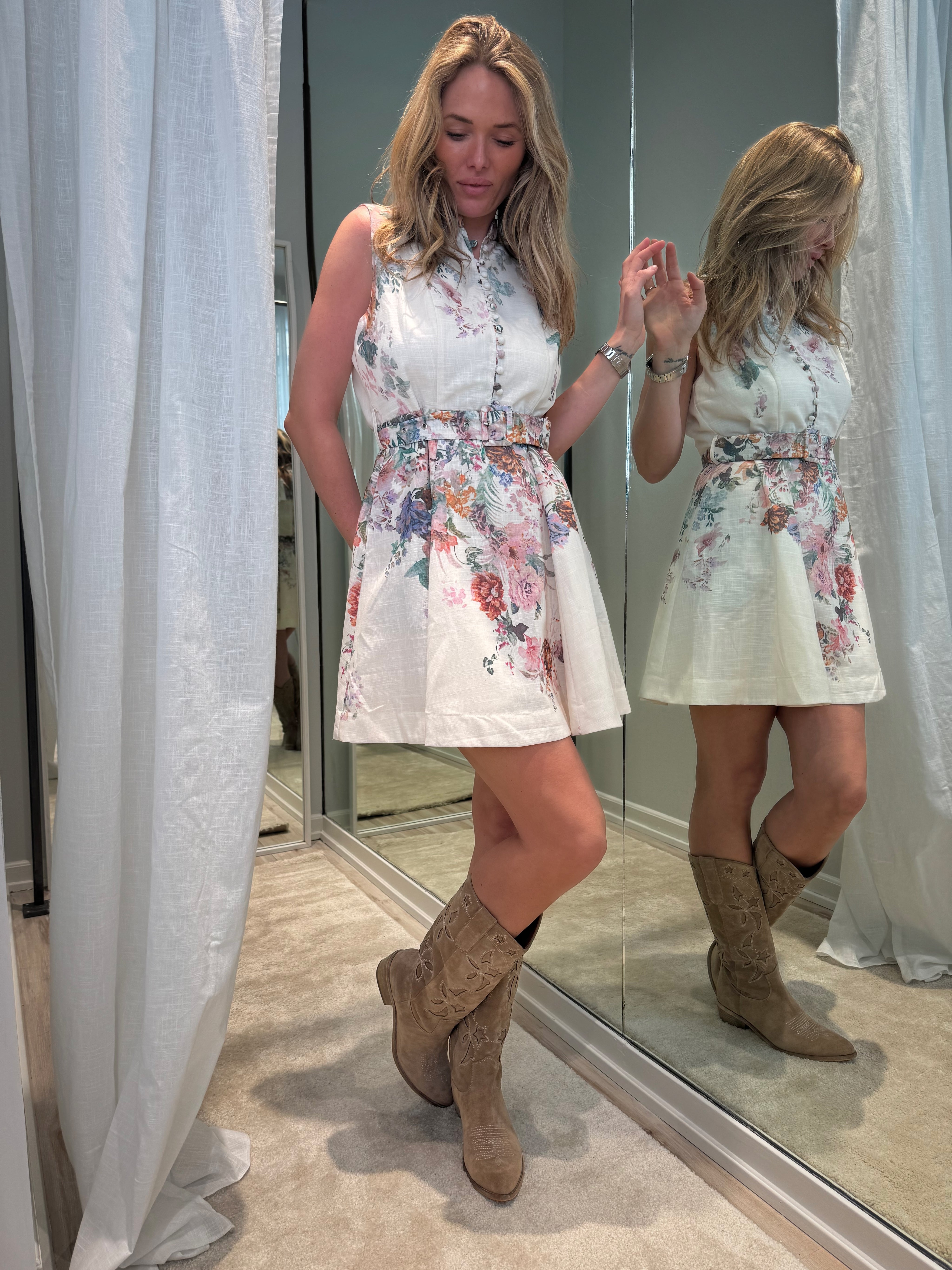 Smuk og romantisk kjole i et feminint floral print. Designet er ærmeløst med høj hals og knaplukning foran, som giver et elegant udtryk. Den korte længde og det aftagelige bælte i taljen fremhæver silhuetten og gør kjolen nem at style til både hverdag og fest