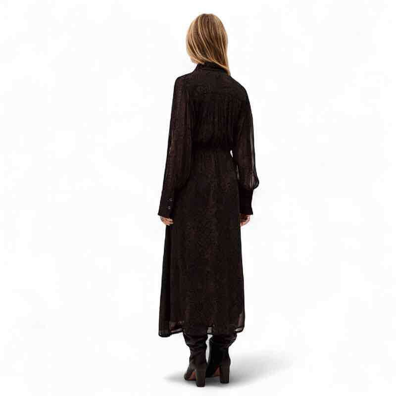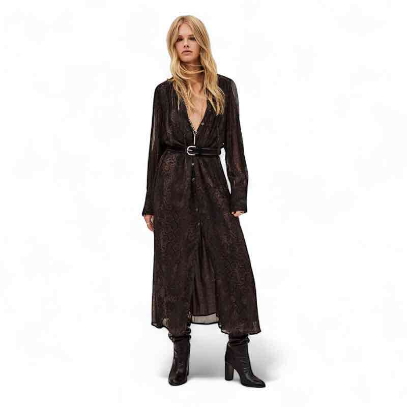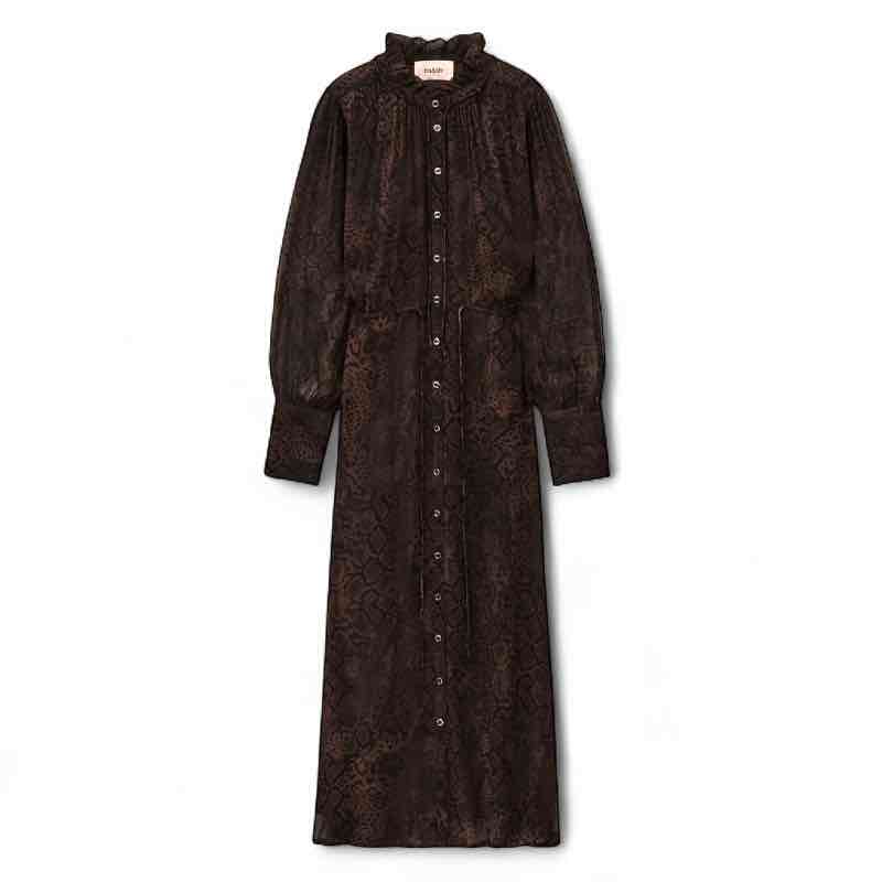 Sahara ba&sh kjole, i det smukkeste python print, lang og elegant med knapper hele vejen ned og snørre i talje med lange ærmer. Smukkeste chokolade brun farve