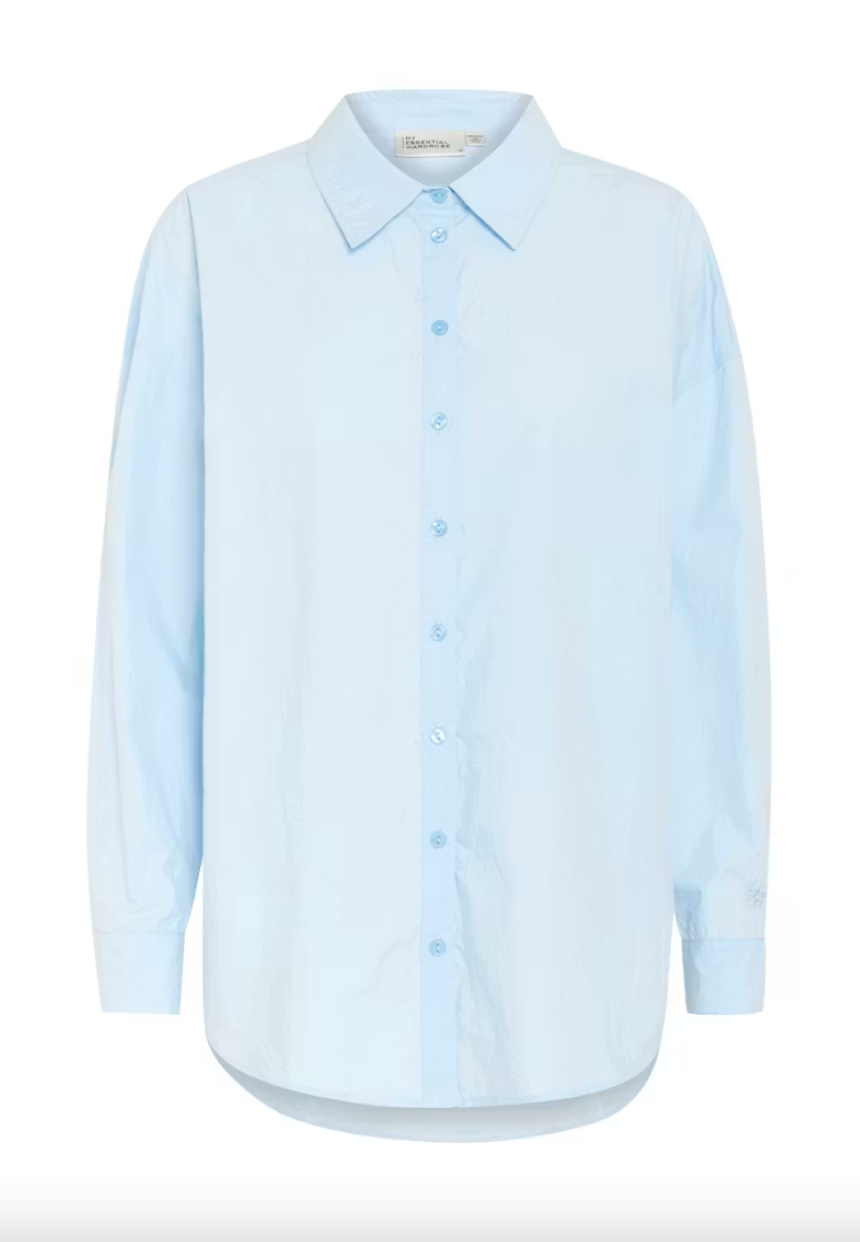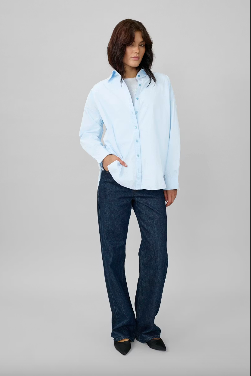 Let oversized skjorte med afslappet silhuet, klassisk krave, med gennemgående knaplukning og lange ærmer med manchetter. Skjorten er i en smuk klar himmelblå, og er en blød let bomulds kvalitet, perfekt til din hverdags gaderobe for et tidløs klassisk outfit.