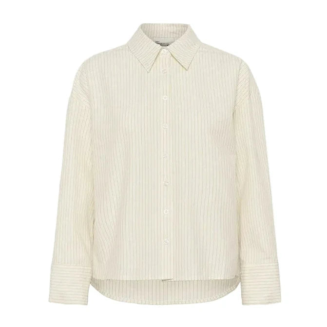 Klassisk, smuk og tidløs stribet skjorte fra My Essential Wardrobe, en en let, blød og lækker bomulds-kvalitet skjorte med krave, knaplukning foran, lange ærmer og lang machetter. Smuk råhvid farve med fine creme farvet lodrette striber. Style med dine ynglings jeans, eller en smuk nederdel.