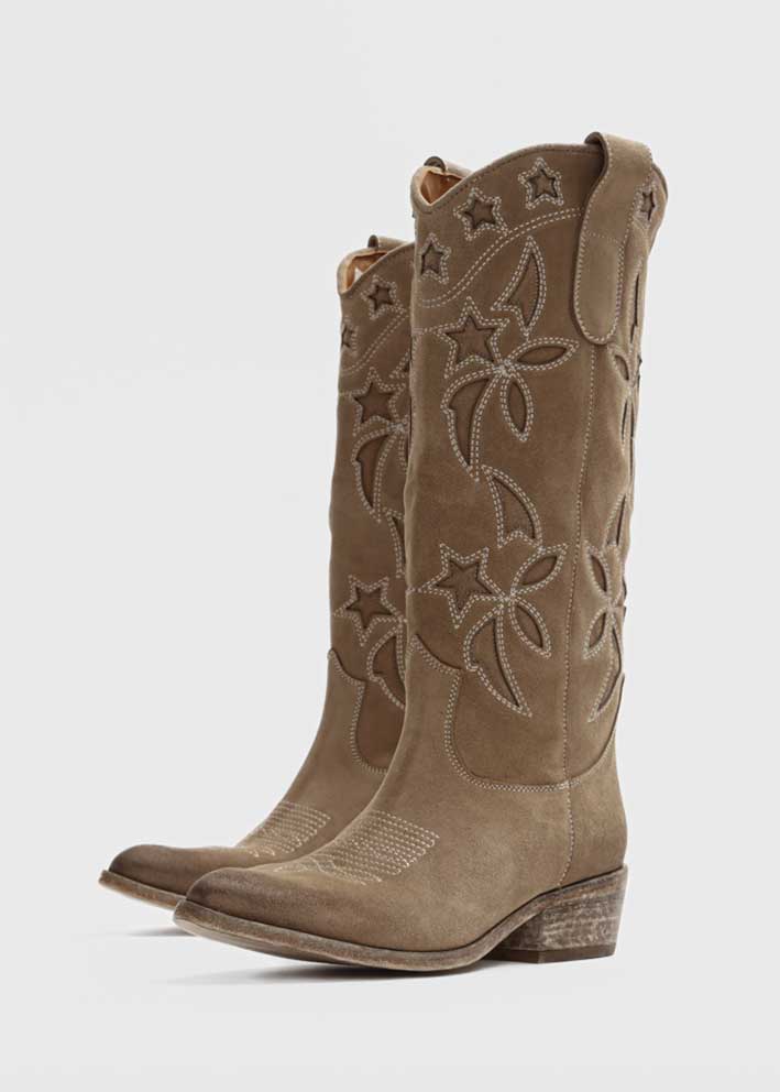 Smukke, cool og flotte langskaftede western-støvler fra Bukela, støvlerne er designet i ruskind og har smukke udskårne dekorationer. Støvlerne har et klassisk look, med stropper forveni skaftet, og er mid høj. Støvlerne er lavet af super lækkert og blødt ruskind og er produceret i Italien. Hæl højden måler 5cm, og skaftet måler 38cm.