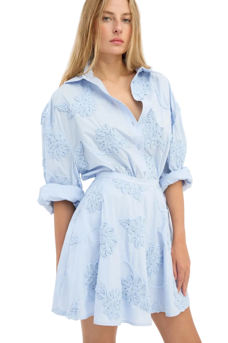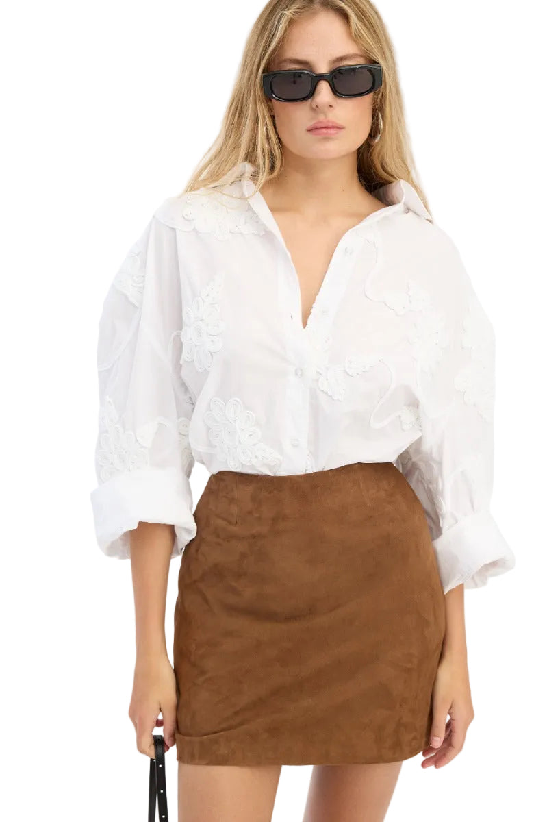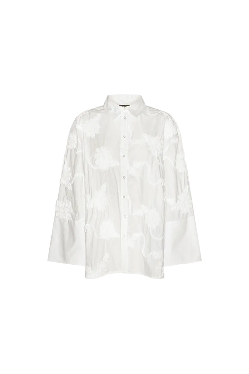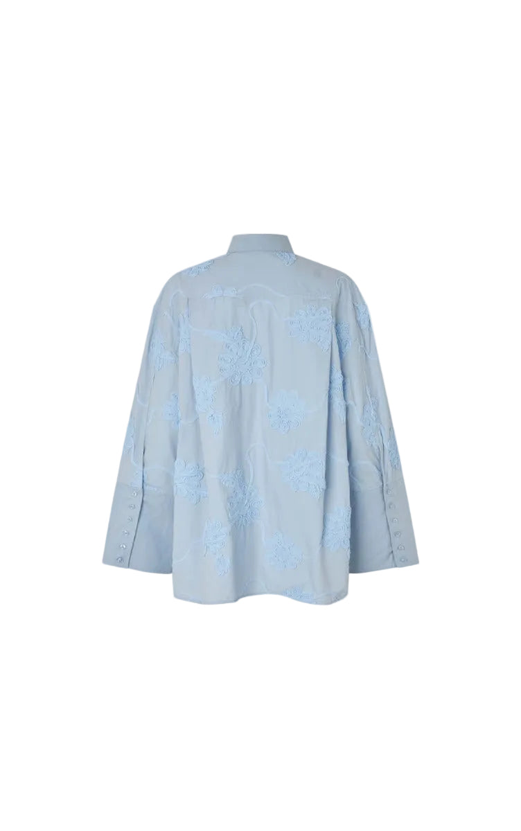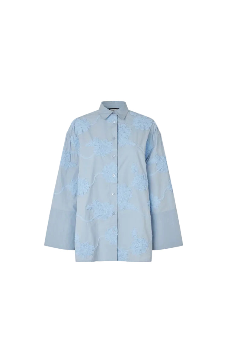 Flower oversize skjorte fra Rotate, i en lækker poplin bomulds-kvalitet, skjorten har en klassisk krave, lange ærmer med store manchetter. Skjorten er dækket med store flotte brodereret blomster, og er en oversize model, så vi anbefalder at size en størrelse ned. Findes i to farver, hvid og lyseblå.