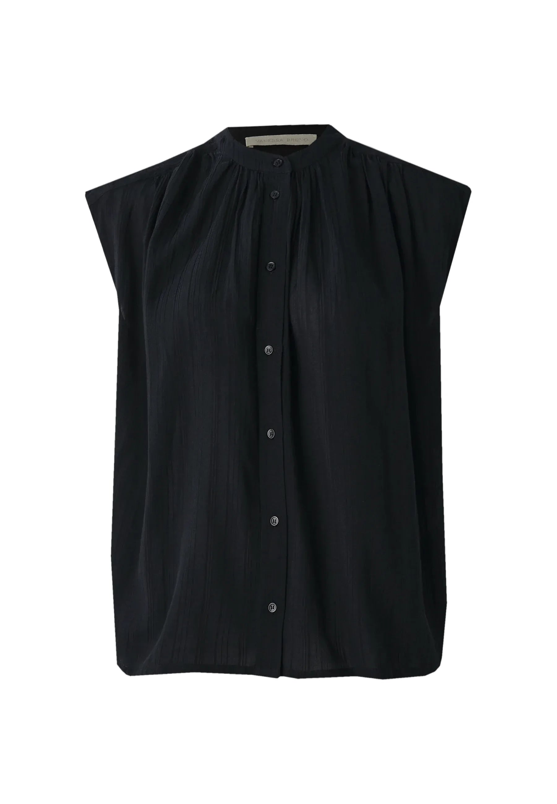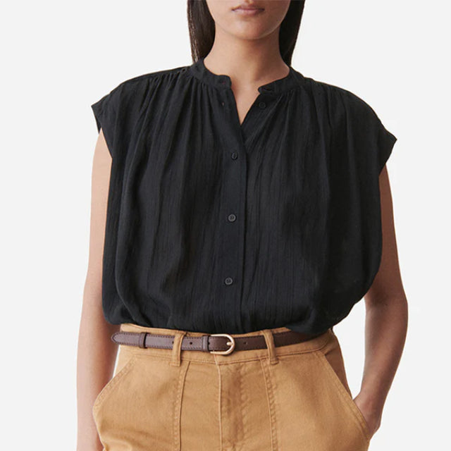 Vanessa Bruno Clio Blouse i Rose Powder er en elegant og luftig bluse i viskose- og bomuldsvoile med diskret jacquardmønster. Den har en rund knaplukket hals, korte ærmer og fine rynkedetaljer, der giver et feminint touch. Perfekt til både hverdag og fest