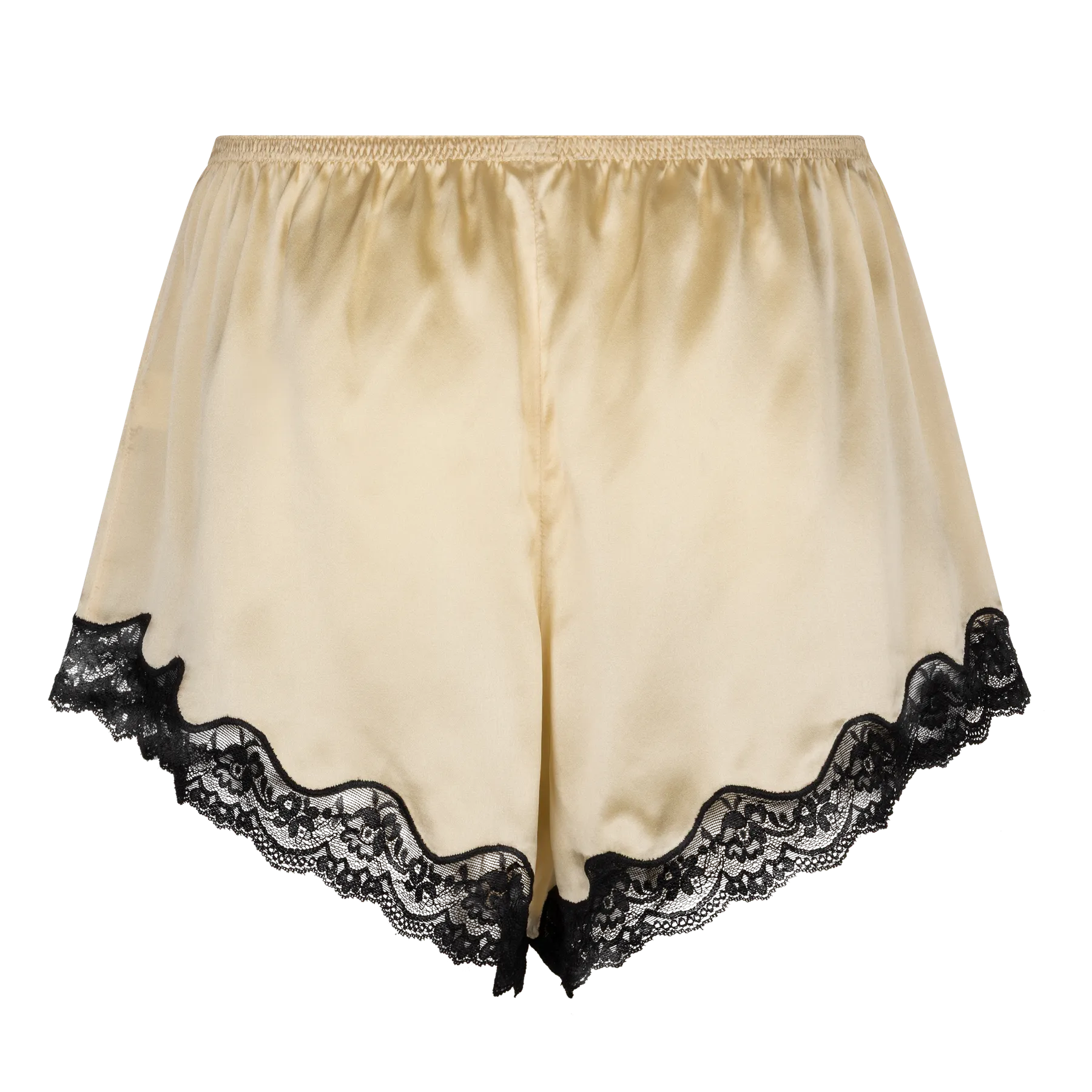 Brooke silk shorts fra Rotate, er en lækker shorts i silke en smuk butter yellow farve, med sorte blonder. Shorts'en har elastik i taljen, med en sød sløjfe foran. Shorts er loose fit men med et high-leg cut. Style den med matchende silke top, for et fuldendt look, eller med en cool t-shirt og blazer for at dress dem op, perfekt til sommer og en ferie-taske