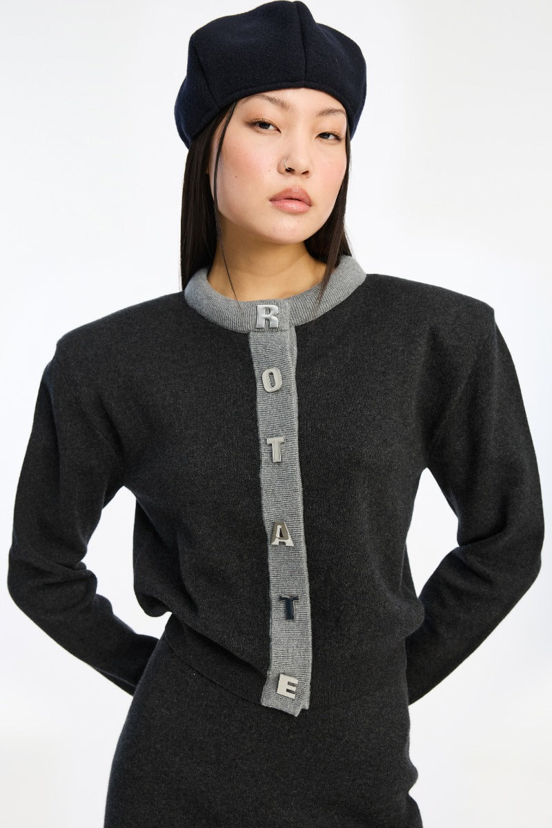Rotate strikket cardigan, er en kort model med to farvet rippet kanter og har metal ROTATE knapper, strikken har skuldre puder, men kan tages ud. Strikken er dejlig let og blød i bomuld og cashmere kvalitet. Et super cool item, til dine vidde bukser eller nederdele.