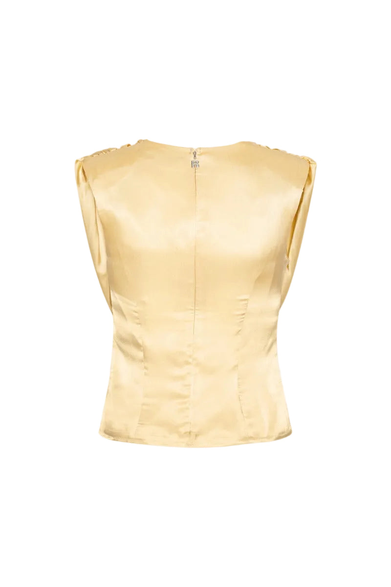En smuk chiffon waterfall top fra Rotate, toppen har en smuk og elegant drapperet vandfalds udskæring, den er let tætsiddende og kort i model, med lynlås i ryggen. Den findens i en smuk butter yellow, som er flot til foirår med hvidt eller blå jeans.
