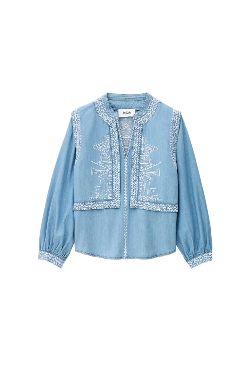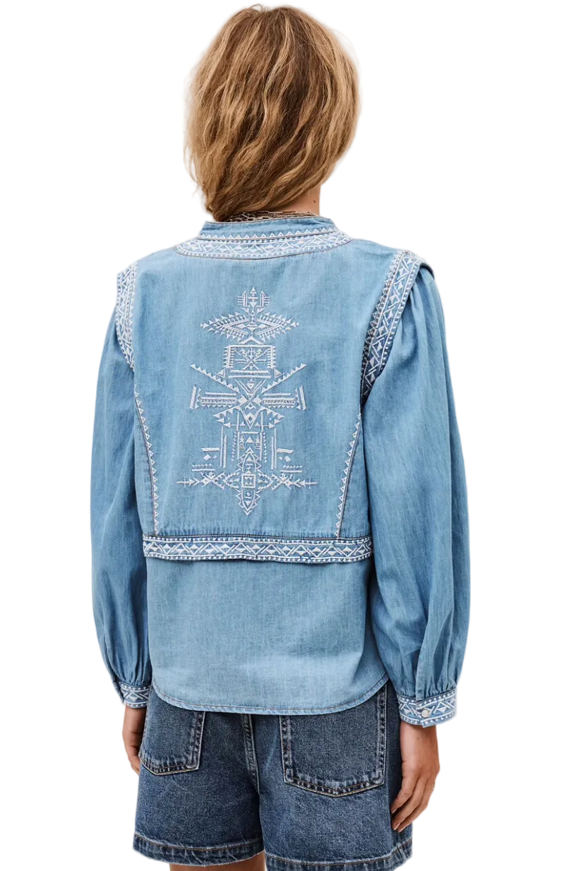 Laura skjorte fra Ba&sh, er en smuk tunica i blødt light denim med v-udskæring, lange ærmer med knaplukning samt smukt og feminint broderi både foran og bagpå. En lækker skjorte som både har det romantiske og afslappet udtryk, da det feminine broderi møder denim.