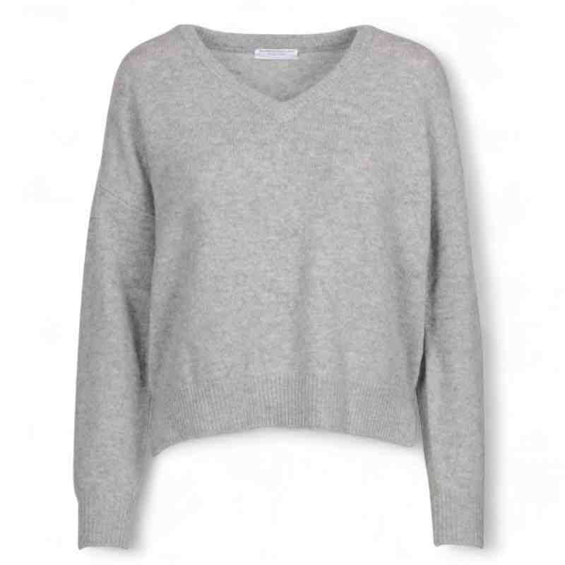 Denne V-hals strik fra Majestic Filatures er strikket i en luksuriøs cashmere-blanding, der gør den både blød, let og varm. Designet har en afslappet silhuet med feminine detaljer som slidser i siderne, der giver bevægelsesfrihed og et moderne udtryk. Den lysegrå farve gør strikken alsidig og let at style til både jeans, bukser og nederdele, mens den tidløse V-udskæring giver et elegant look. En perfekt sweater til dig, der ønsker komfort og luksus i hverdagen