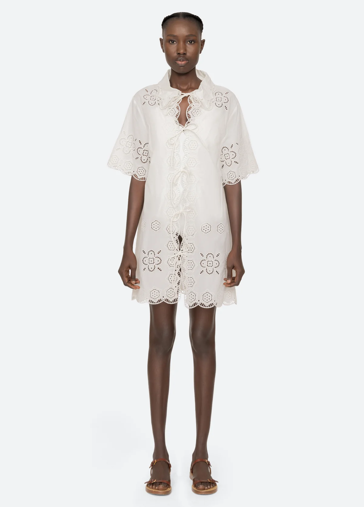 Babette skjorte er en smuk skjorte-kjole, med blonde og broderi, en luftig mini silhuet med gennemgående hulmønster-detaljer, bølgede kanter, korte ærmer og bindelukning foran. Dens afslappet pasform og design gør den til det perfekte, lag over en jeans, shorts eller lag til resortbrug.