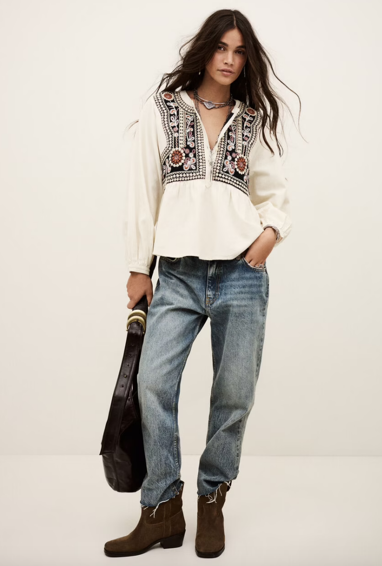Alec skjorte fra Ba&sh er en smuk skjorte, med broderi på brystet i nogen skønne farver, skjorten er med rund hals, og har et V snit med knapper, den har vidde og lange puffet ærmer, en smuk, luksusiøst skjorte, skal styles med både løse, stramme og vidde jeans, og støvler.