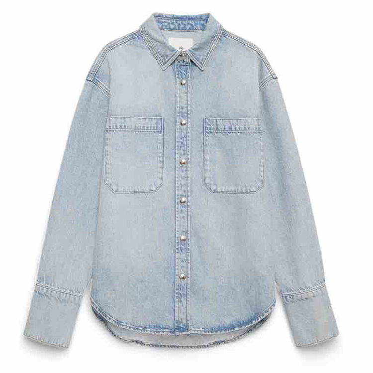 Den oversized pasform giver et ubesværet look, mens de store forlommer og de karakteristiske ANINE BING-trykknapper tilfører et moderne touch. De brede manchetter fuldender skjortens tidløse design, der gør den ideel både som skjorte og let jakke.