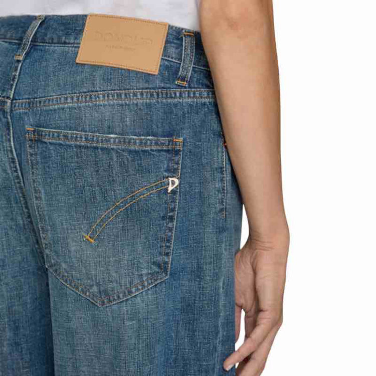 Dondup DP775 Marlen wide-leg jeans. Med en perfekt regular waist og en ekstra vid silhuet balancerer disse jeans ubesværet mellem moderne edge og klassisk femininitet. Den eksklusive 9 oz bomuld-lyocell rigid bull denim sikrer en luksuriøs følelse og et smukt fald, mens den garment-dyed finish tilføjer dybde og karakter til stoffet. Style dem med en skarp blazer og hæle for en power-look, eller lad dem flyde elegant med en chunky strik og loafers for en sofistikeret hverdagsstil. Uanset hvordan du bærer dem, er disse jeans et statement piece, der forener komfort og high fashion