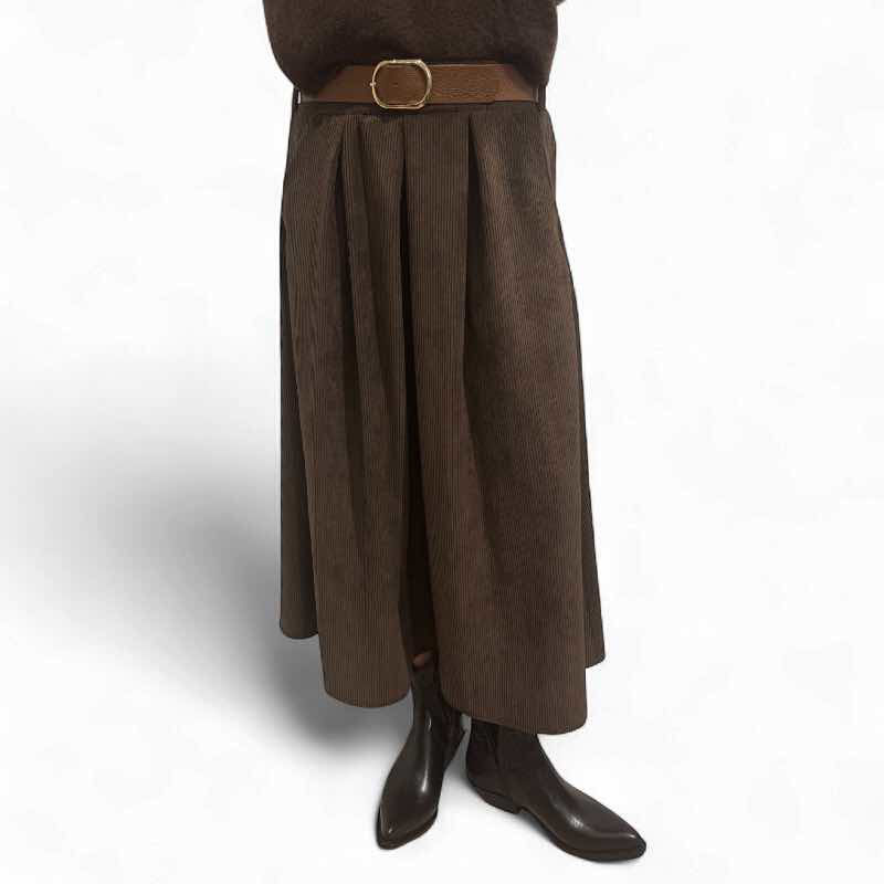 Lang nederdel i det lækre lette velour stof. Modellen har læg foran men ikke i sider eller bagpå, som giver et smalt og slank udtryk, nederdelen har lommer og brunt spænde bælte. Perfekt til efteråret, med strik og støvler for et ekslusivt, cozy udtryk. Nederdelen er one size men har elastik, så passer de fleste.