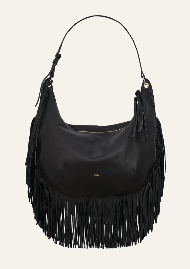 Swing tasken fra ba&sh er en lækker skind taske, i en halv måne form med lange frynser, tasken har lynlås lukning og skuldre stropper og en signatur logo foran.