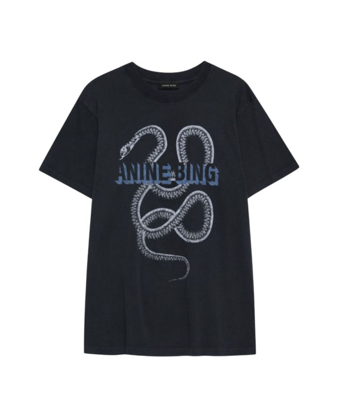 Lili snake tee fra Anine bing, er hendens populære t-shirt, i den lækre, bløde og lette bomuld kvalitet, i forvasket sort som giver et cool vintage-look. T-shirten har et lille ærme, rundhals, og et cool snakeprint foran med Anine Bing logo. Den er fremstillet i blød bomuldskvalitet, og er en let afslappet model.